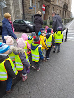 W związku z tematem dnia „Bezpieczna droga do przedszkola” wybraliśmy się na pobliskie skrzyżowanie, obserwowaliśmy ruch drogowy i znaki drogowe w okolicy przedszkola. wycieczka przebiegła spokojnie, dzieci dzielnie trzymały się węża. Dalej poszliśmy aleją kasztanową w celu nazbierania kasztanów do kącika przyrodniczego.