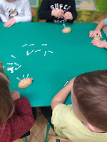 Poznaliśmy kolejne warzywo jakim jest ziemniaczek, dowiedzieliśmy się jakie potrawy można przyrządzać z ziemniaka a na koniec stworzyliśmy jeżyka z ziemniaka. W pracy pomagała nam trochę pani, ale kolce wbijaliśmy sami. Brawo Biedroneczki.