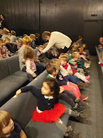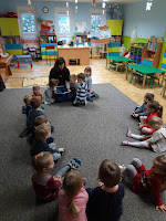 Wiersz pt. „Lokomotywa” przeczytał nam tato Bruna. Bawiliśmy się w wesoły pociąg, potem wspólnie wykonaliśmy kolorowe wagoniki, które doczepiliśmy do dużej lokomotywy. Dziękujemy za miłe spotkanie.
