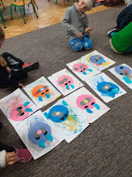 Tak pracujemy przy stolikach: staramy się wykonywać polecenia, uważnie słuchamy i kreślimy, naklejamy, komponujemy i oczywiście rozmawiamy o swoich wytworach plastycznych.