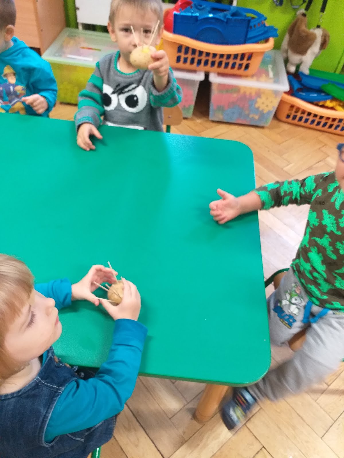 Poznaliśmy kolejne warzywo jakim jest ziemniaczek, dowiedzieliśmy się jakie potrawy można przyrządzać z ziemniaka a na koniec stworzyliśmy jeżyka z ziemniaka. W pracy pomagała nam trochę pani, ale kolce wbijaliśmy sami. Brawo Biedroneczki.