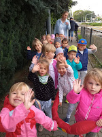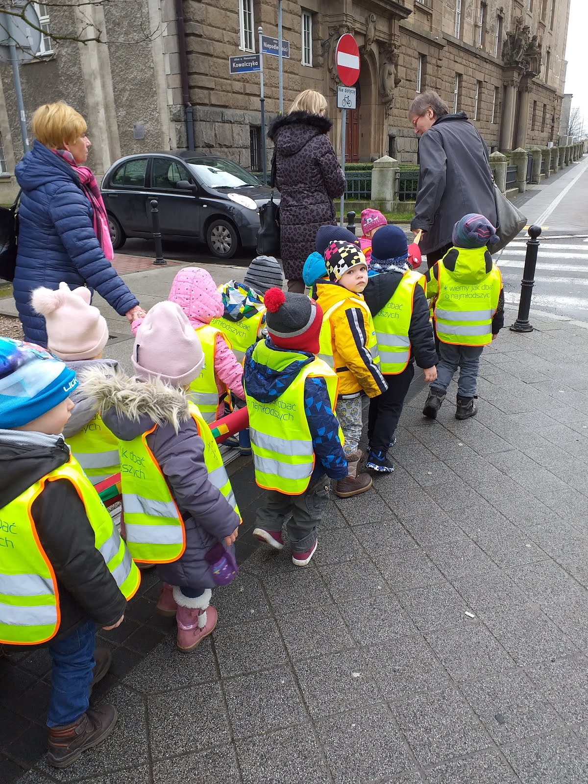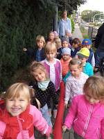 W związku z tematem dnia „Bezpieczna droga do przedszkola” wybraliśmy się na pobliskie skrzyżowanie, obserwowaliśmy ruch drogowy i znaki drogowe w okolicy przedszkola. wycieczka przebiegła spokojnie, dzieci dzielnie trzymały się węża. Dalej poszliśmy aleją kasztanową w celu nazbierania kasztanów do kącika przyrodniczego.