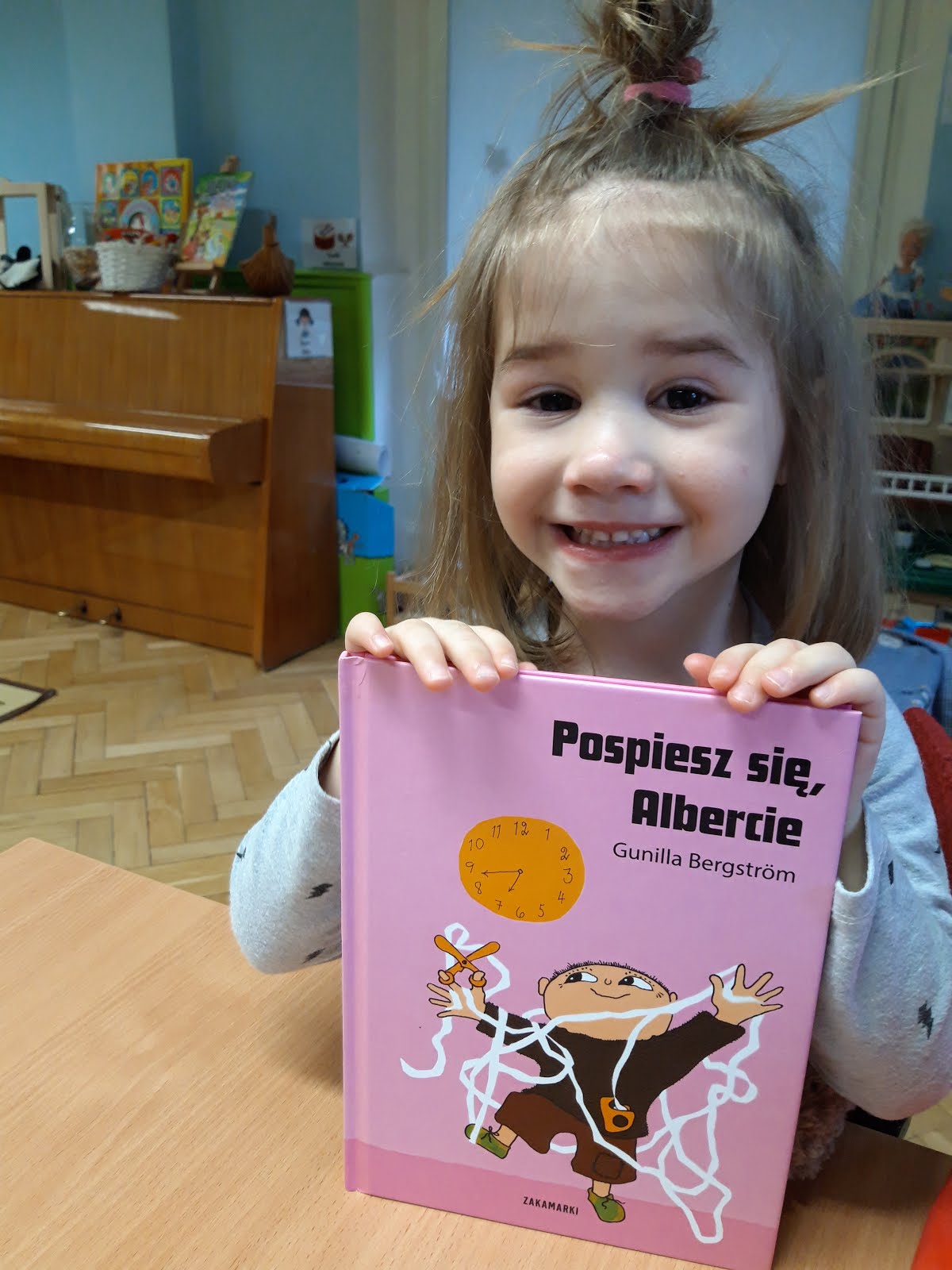 W ramach naszych warsztatów czytelniczych już drugi raz mama Iguni przedstawiła nam przygody Alberta. Tym razem książka nosiła tytuł „Pospiesz się Albercie”. Z uśmiechem na twarzy słuchaliśmy jak Albert szykuje się do przedszkola i za każdym razem „jeszcze tylko” musi koniecznie coś wykonać. Z chęcią wykonaliśmy Zegar dla Alberta, aby przypominał nam o punktualności…