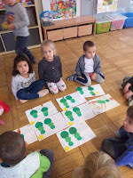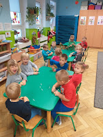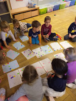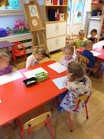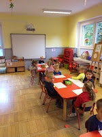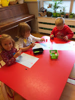 Tak pracujemy przy stolikach: staramy się wykonywać polecenia, uważnie słuchamy i kreślimy, naklejamy, komponujemy i oczywiście rozmawiamy o swoich wytworach plastycznych.