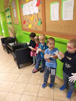 Wiersz pt. „Lokomotywa” przeczytał nam tato Bruna. Bawiliśmy się w wesoły pociąg, potem wspólnie wykonaliśmy kolorowe wagoniki, które doczepiliśmy do dużej lokomotywy. Dziękujemy za miłe spotkanie.