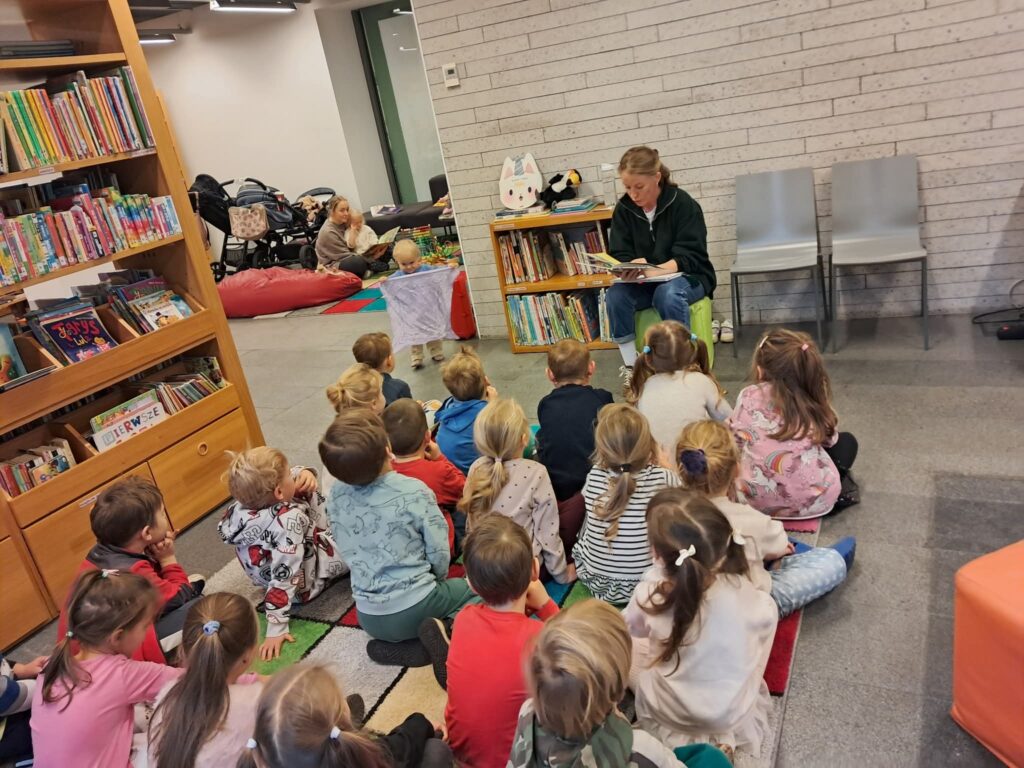 Biedronki w Bibliotece Raczyńskich. Lekcja biblioteczna o drzewach,które są ważne w przyrodzie i musimy o nie dbać i szanować.
