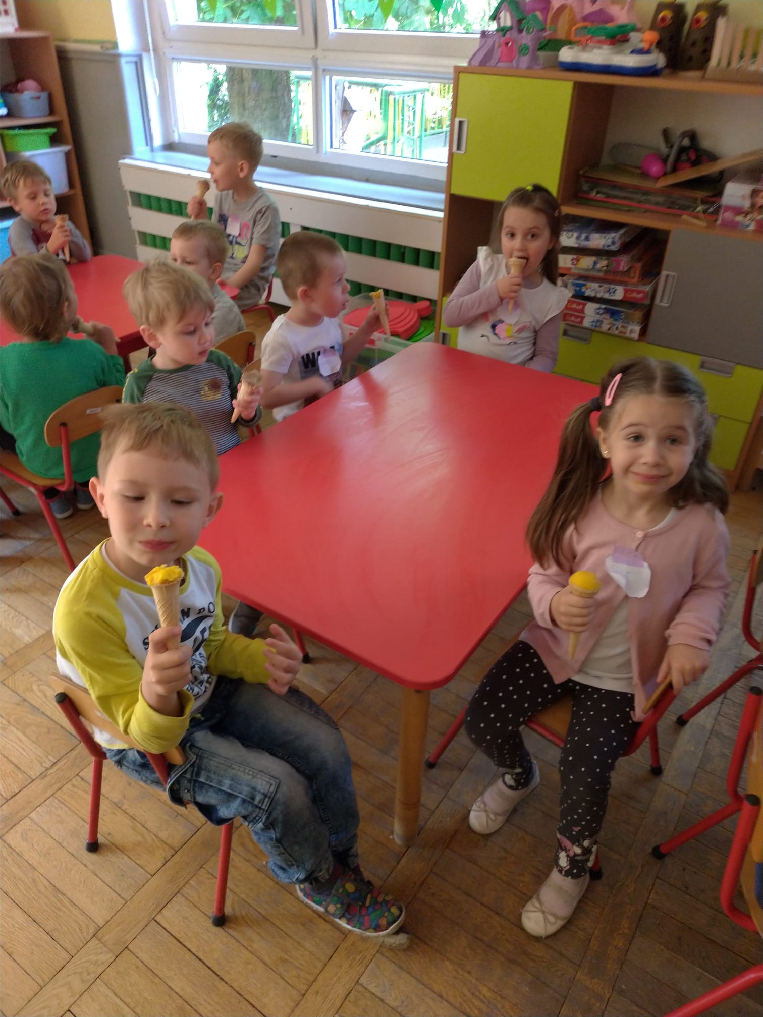 W Dniu Dziecka czekała na wszystkie dzieci miła niespodzianka. Na ten jeden dzień na korytarzu przedszkolnym powstało stoisko z pysznymi lodami. Radość była wielka a lody pyszne. Dziękujemy Radzie Rodziców za sfinansowanie wspaniałej niespodzianki.